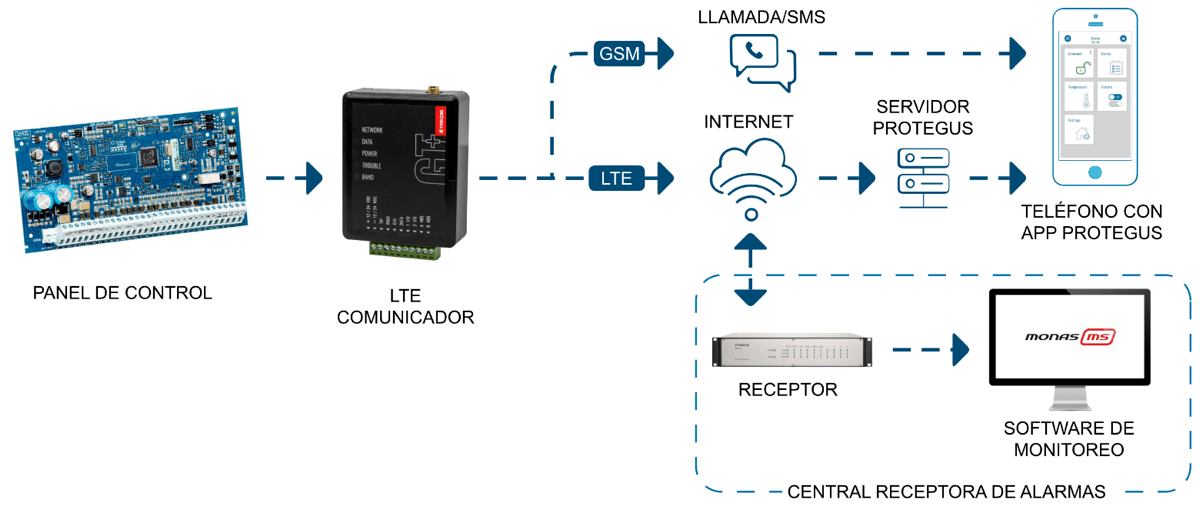 El comunicador está diseñado para transmitir mensajes sobre eventos del panel de control la Centro de Monitoreo y a la aplicación Protegus2.
