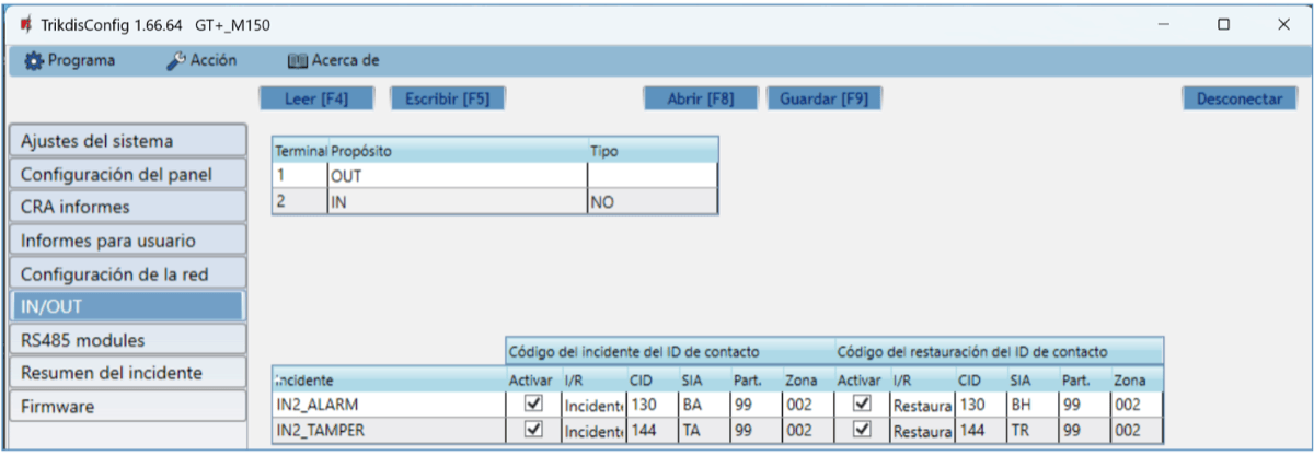 Puede enviar información de eventos a SIA DC-09 receptores. El anexo contiene tabla de conversión de los códigos (Contacto ID a SIA).