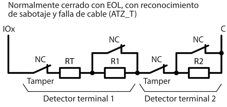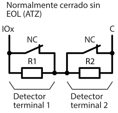 10 terminales de I/O, cada uno de los cuales se puede configurar como entrada (IN) o como salida (OUT). Tipos de entrada (IN): NC, NA, EOL, EOL-T, ATZ, ATZ-T. Los circuitos ATZ y EOL pueden usar diferentes valores de resistencia.
