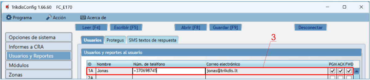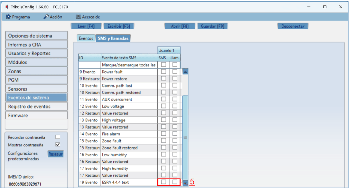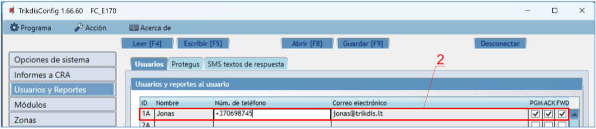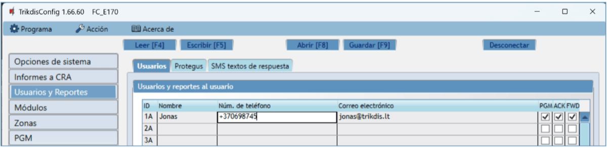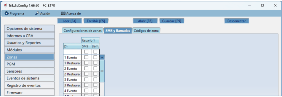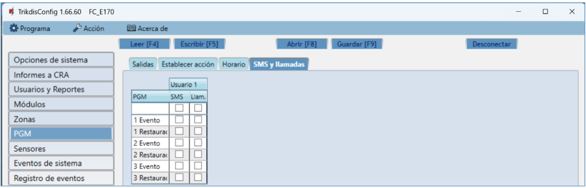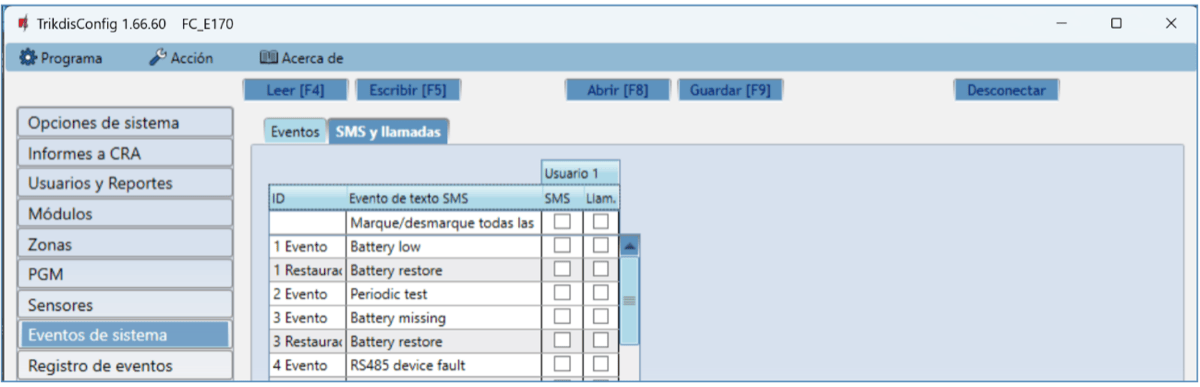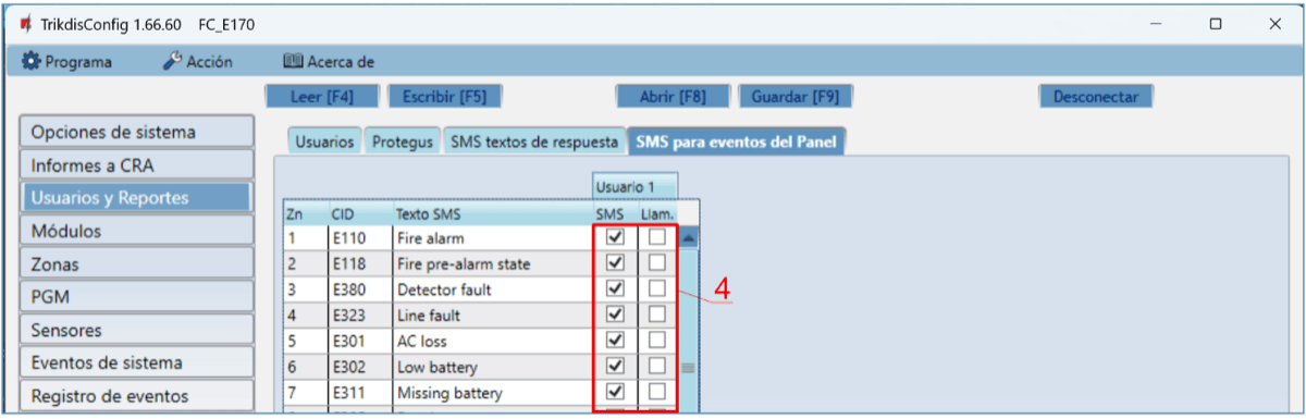 Usuario / SMS y Llam. – elige las formas en que se informará a los usuarios sobre cada evento: mensaje SMS y/o Llamada telefónica.