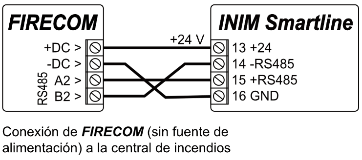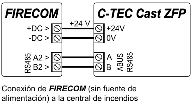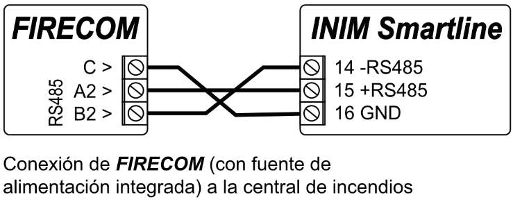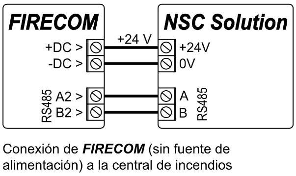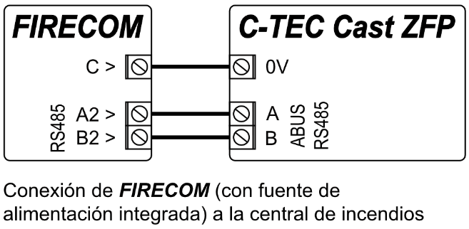 | A2 RS485 | Bus RS485 para conectar el panel de control de alarma contra incendios |