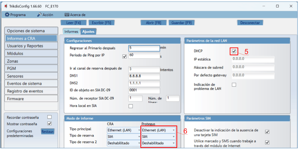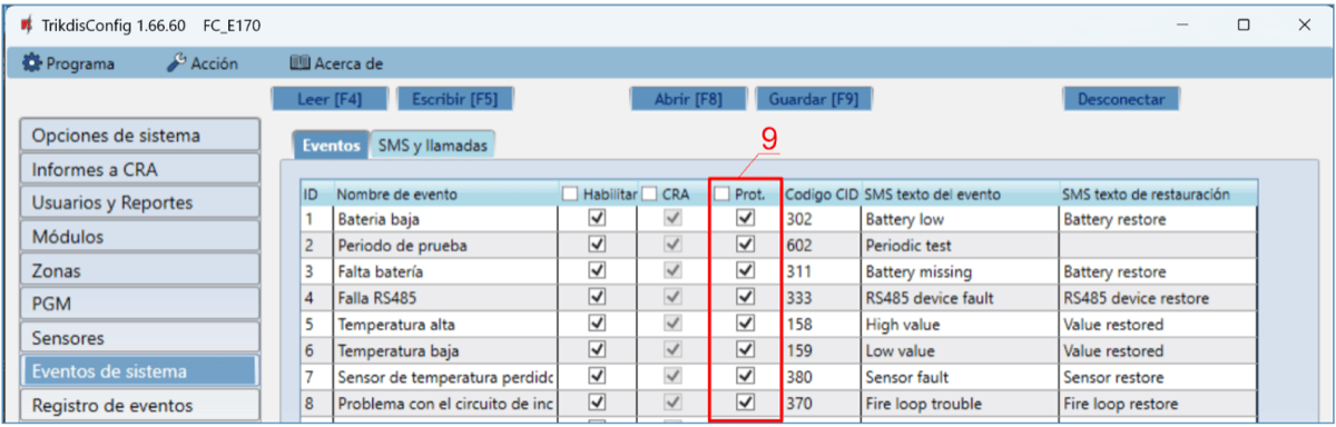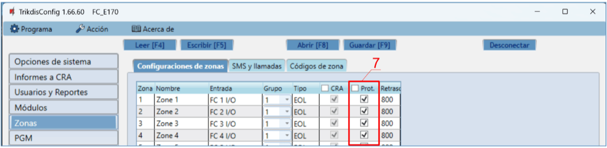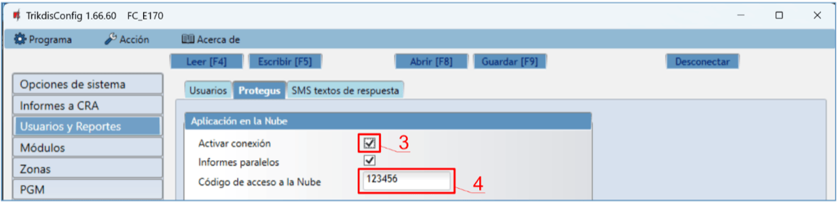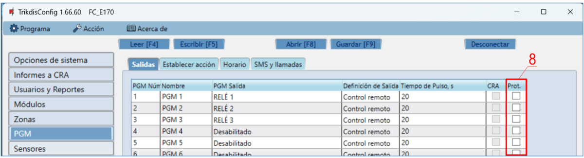 Prot. – si la casilla está marcada, los informes de activación/desactivación de la salida PGM se enviarán a la nube de Protegus2.