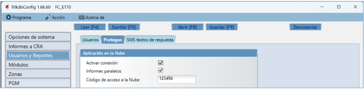 La servicio Protegus2 está activada. Podrá encontrar información sobre como activar la nube en la sección 6.4 Ventana de "Usuarios y Reportes".