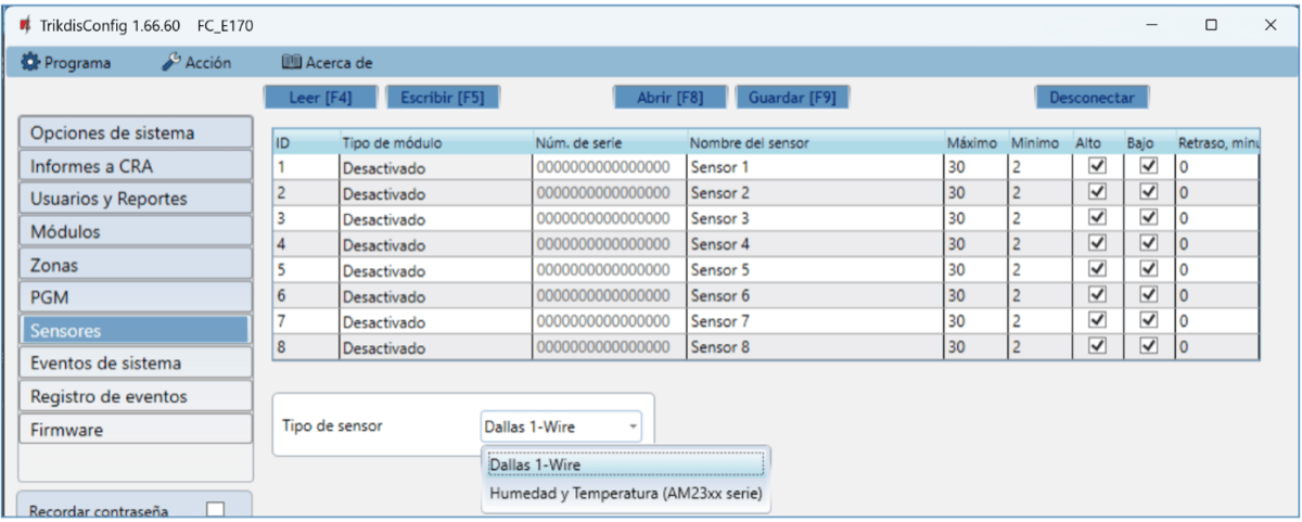 | Máximo de sensores de temperatura conectados al bus de datos de 1-Wire | 8 (Dallas) o 1 (si se usa un sensor de la serie AM2301) |