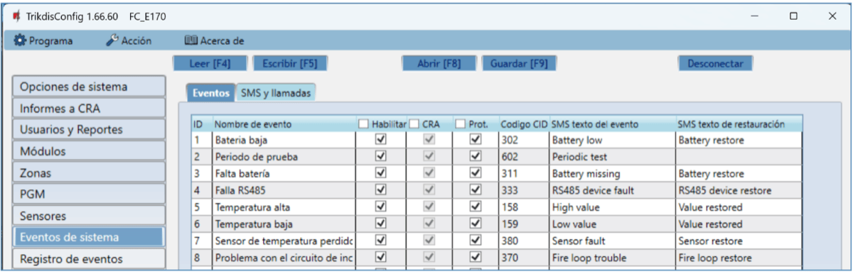 | Codificación de eventos | Contact ID, SIA |