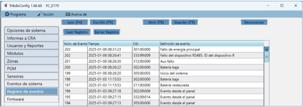 Botón “Leer Registro” – comando para leer el registro de eventos desde la memoria del dispositivo.