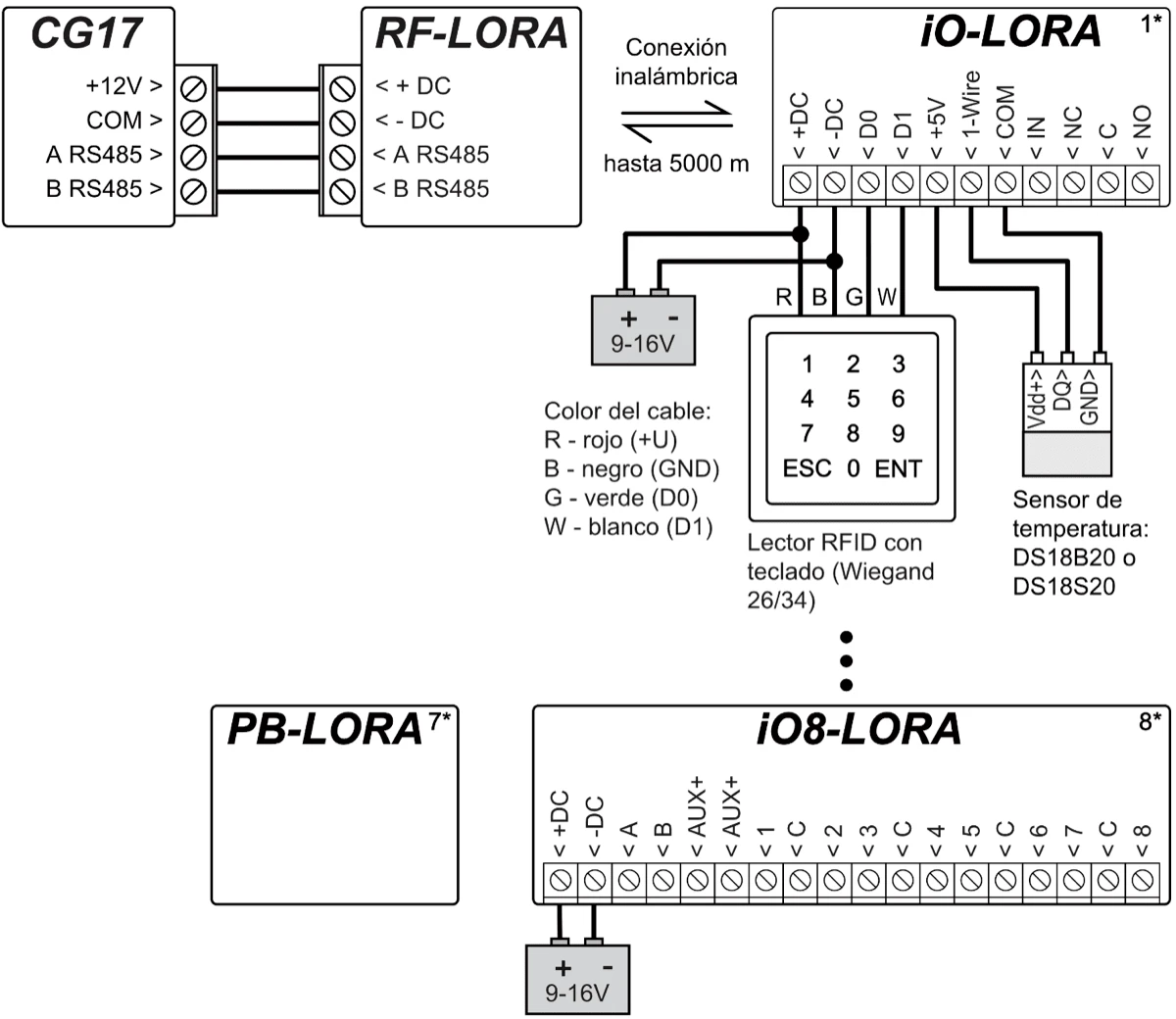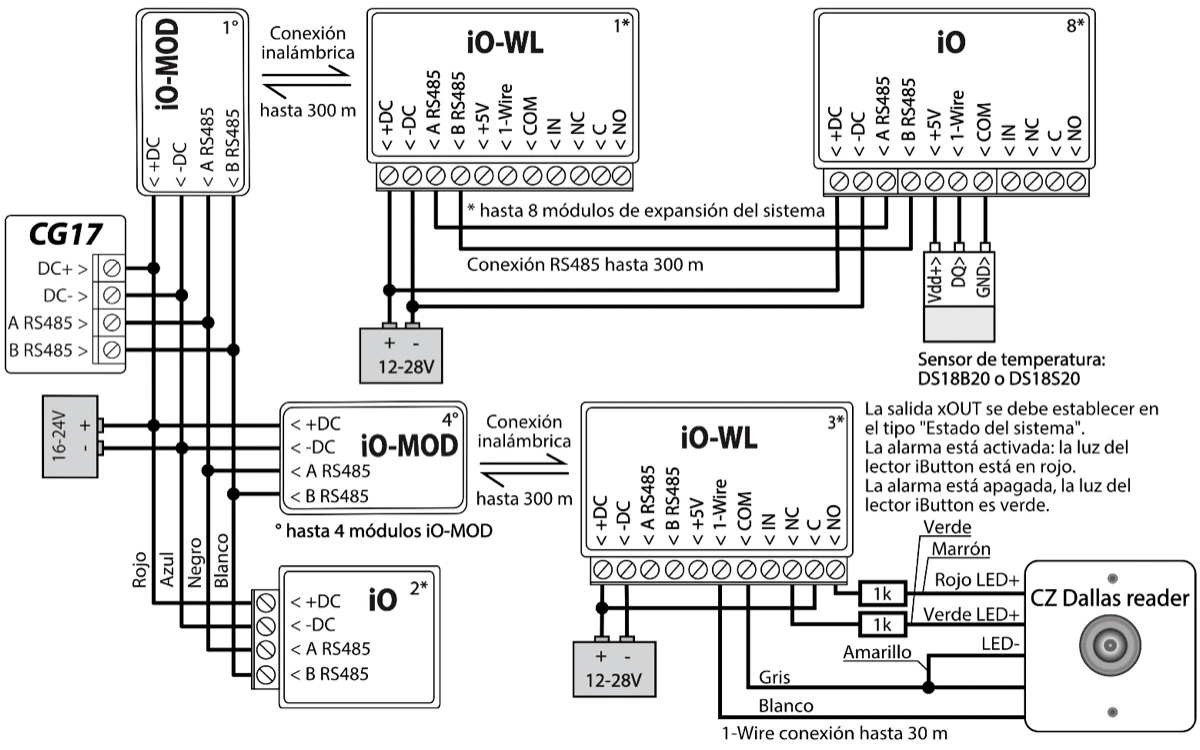 - El número de entradas (IN) o salidas (OUT) se puede aumentar a 12 utilizando expansores cableados o inalámbricos de la serie iO, LORA.