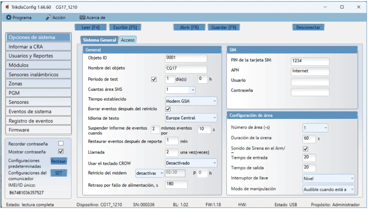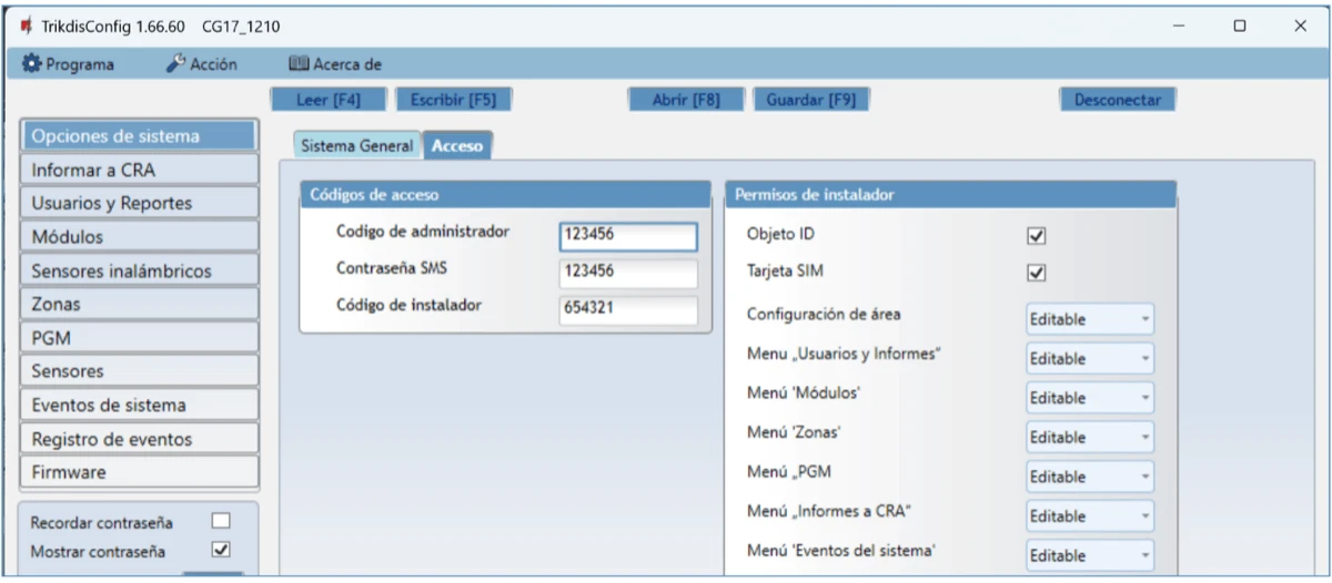 Haga clic en el botón Leer [F4] y el programa leerá los valores de los parámetros establecidos actualmente en el CG17. Si aparece una ventana para ingresar el código de administrador, ingrese el código de administrador de 6 símbolos. Si desea que el programa recuerde el código, marque la casilla junto a “Recordar contraseña” y haga clic en el botón Escribir [F5].