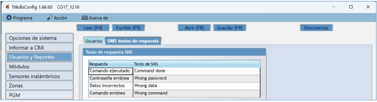 | TXTR | Z1= / ........ / Z12= | Personalizar texto de restauración de zona: Z1 ... Z12 - ingrese el número de zona. Por ejemplo: TXTR 123456 Z1=Restore Zone1 |