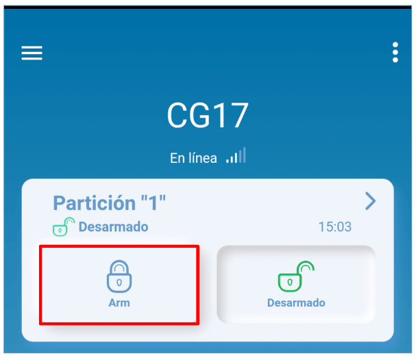 Pestaña “Particiones”. Presione el botón “DESARMAR” (o “ARMAR”) e ingrese el código de usuario y el área del panel de control de seguridad será “DESARMAR” (o “ARMAR”).