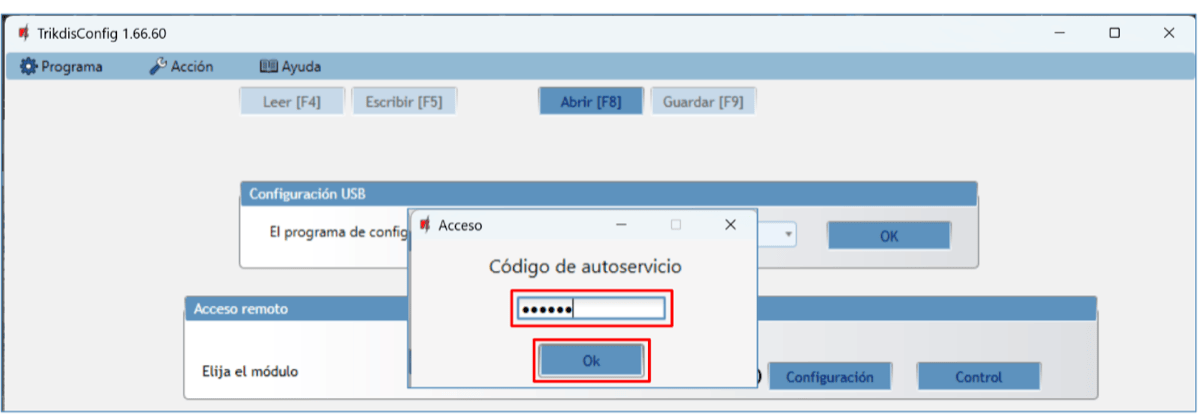 Ingrese el “Código de autoservicio” (código predeterminado - 123456) y presione el botón “OK”.