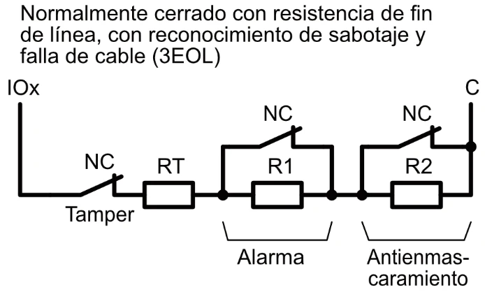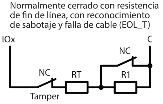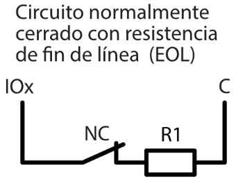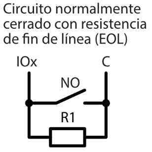 | Terminales de doble propósito [I/O] | 10; Función IN o OUT seleccionada durante la programación. Si se selecciona IN, tipos disponibles: NC, NO, EOL, EOL_T, 3EOL, ATZ, ATZ_T. Si se selecciona OUT, la terminal se convierte en colector abierto (OC) con una corriente de hasta 100 mA |