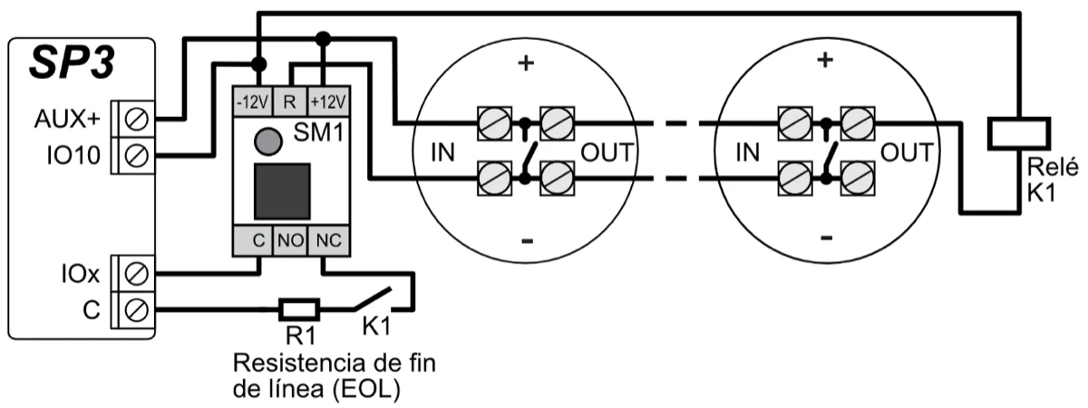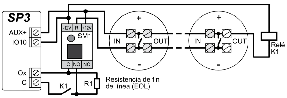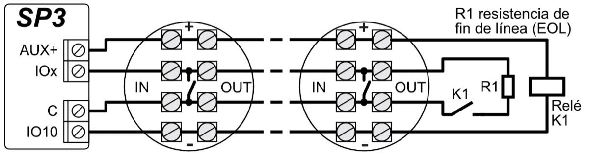 10 terminales de I/O, cada uno se puede configurar como terminal de entrada (IN) o salida (OUT). Tipos de entrada (IN): ATZ, EOL, NC, NO. Se pueden usar diferentes valores nominales de resistencias en los circuitos de tipo EOL y ATZ. El número de entradas IN se puede ampliar a 64 con el uso de teclados y módulos de expansión iO, iO-8, iO8-LORA, iO- LORA e iO-WL.