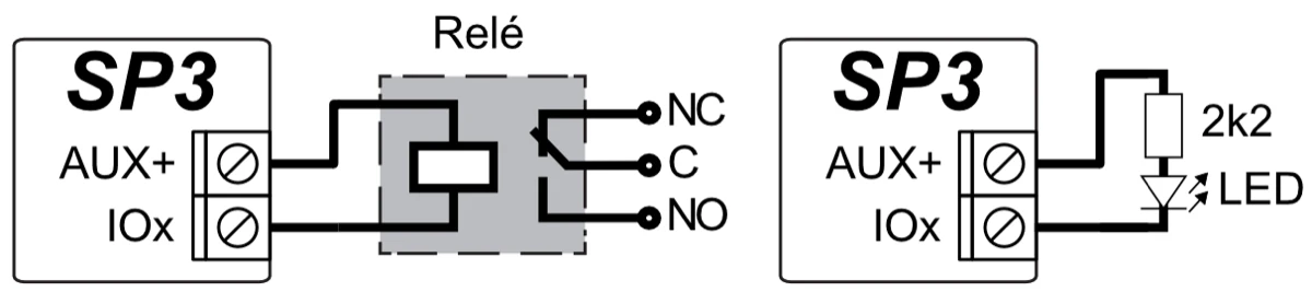 La placa cuenta con 2 salidas. BELL es para controlar la sirena, y LED es para controlar las luces indicadoras. El número de salidas se puede ampliar a 16 utilizando los módulos de expansión iO, iO-8, iO8-LORA, iO-LORA, REL-LORA e iO-WL. Siete configuraciones operativas de salida. A cada salida se le puede asignar una lógica operativa, un programa de operación preestablecido, cualidades, por ejemplo, modo termostato