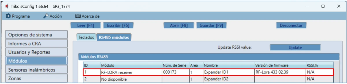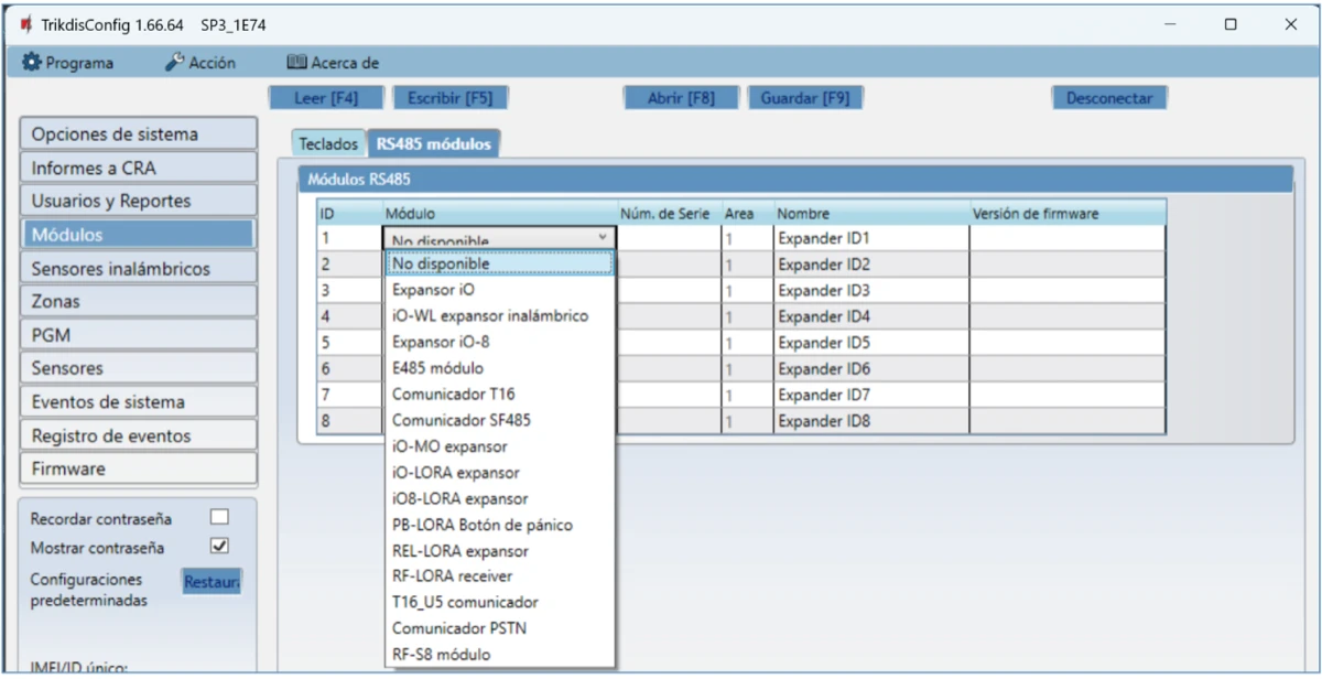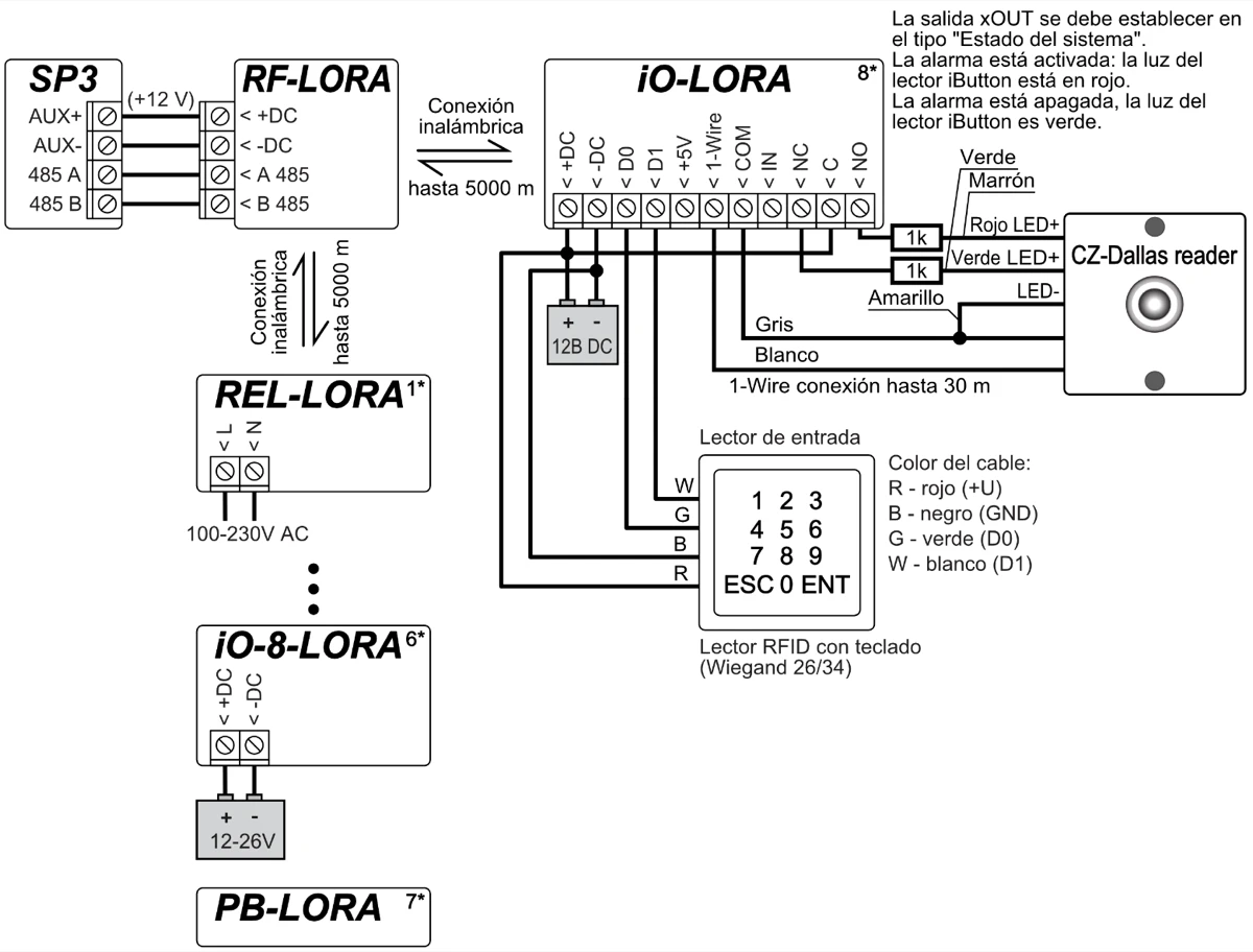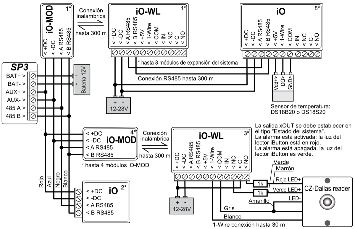 | Módulos soportados | iO-8 – módulo expansor; / iO – módulo expansor; / iO-MOD – iO-WL – Transmisor-receptor de ondas de radio; / iO-WL – módulo expansor inalámbrico; / RF-SH – receptor de ondas de radio para sensores inalámbricos; / RF-HW - receptor de ondas de radio para sensores inalámbricos; / RF-S8 - receptor de ondas de radio para sensores inalámbricos; / RF-LORA - receptor de ondas de radio para sensores inalámbricos; / E485 – módulo para conectarse a la red Ethernet; / TM17 – lector iButton; / CZ-Dallas – lector iButton; / T16 – Transmisor de ondas de radio VHF o UHF; / SF485 – módulo para conectarse a la red Sigfox; / iO-LORA - módulo expansor; / iO8-LORA - módulo expansor; / PB-LORA – botón de pánico; / REL-LORA – módulo de relé; / Lector RFID. |