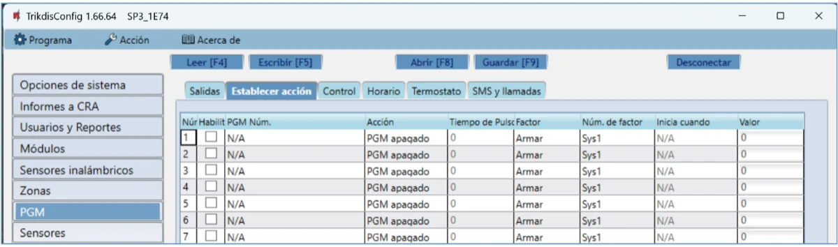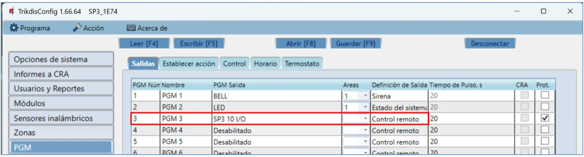 Para probar las salidas del panel de control (PGM), enciéndalas remotamente y verifique su funcionamiento.