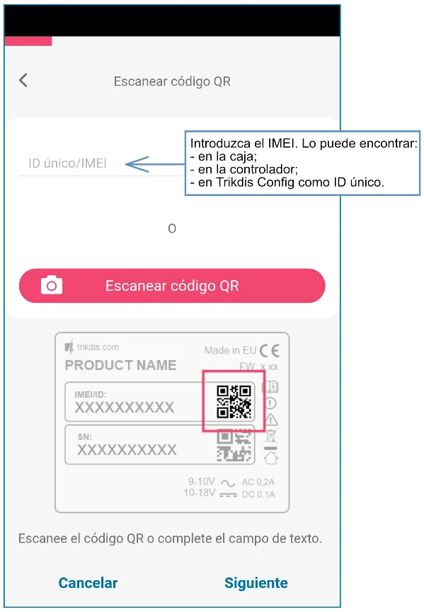 En el campo "ID único", ingrese el número IMEI del control de panel. Este número puede ser encontrado en el dispositivo y en la etiqueta del empaque.