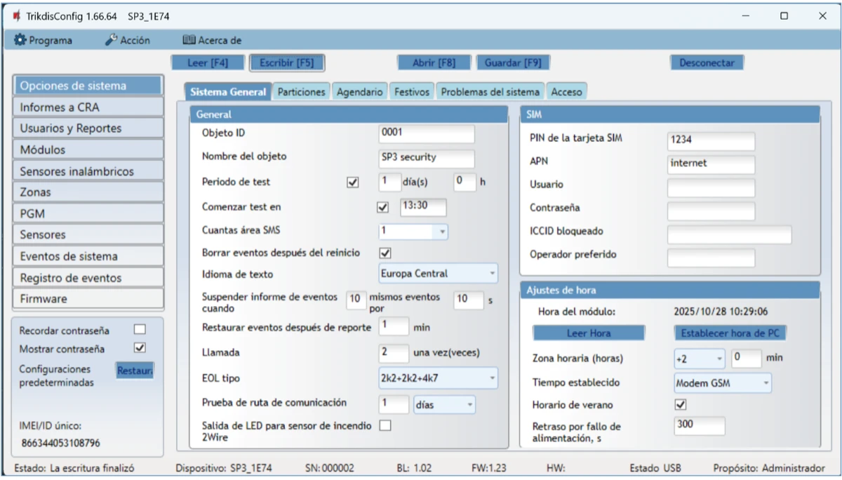 | Canales de transmisión de informes de eventos | GPRS o 4G, WiFi, LAN (con módulo E485), SMS, Llamada de voz (Para panel de seguridad SP3_12xx con versión de firmware hasta 1.13 inclusivo), ondas de radio VHF/UHF (con transmisor T16) |