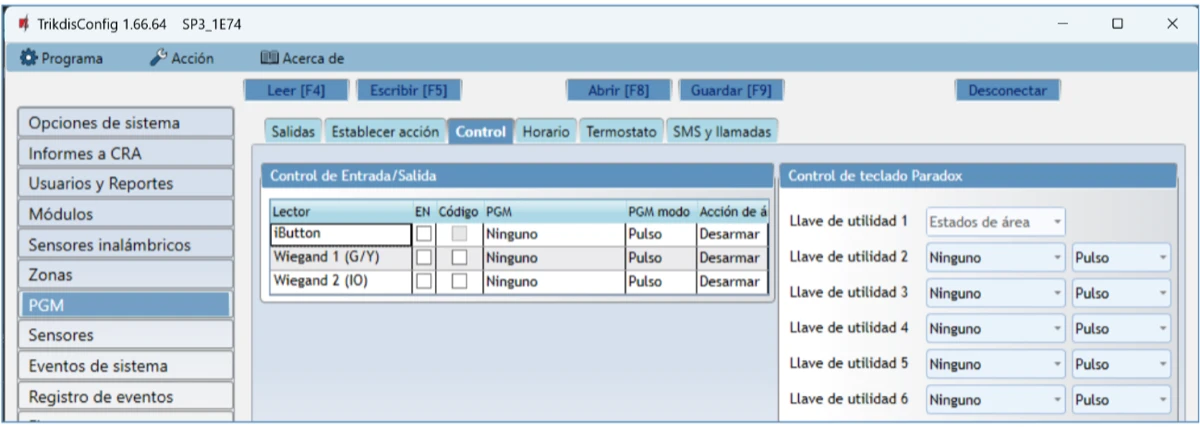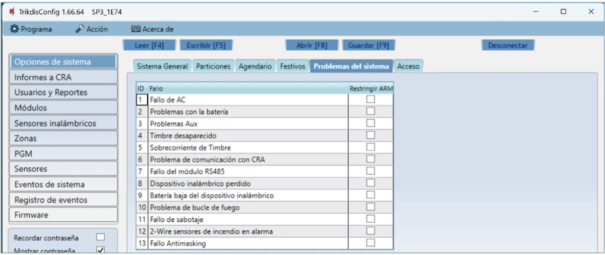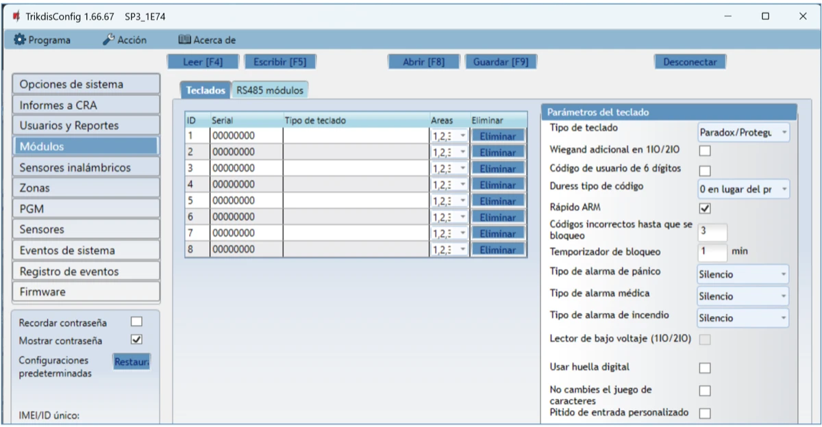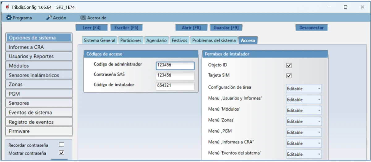 Se abrirá la ventana de configuración del control de panel. Presione el botón Leer [F4] para leer la configuración del control de panel. Si aparece una ventana pidiéndole que ingrese el código de administrador o instalador, ingrese el código de administrador o instalador de 6 dígitos. Marque la casilla junto a Recordar contraseña y presione el botón Escribir [F5].