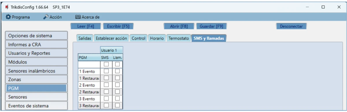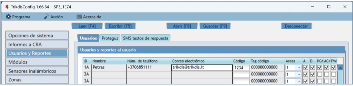 Esta pestaña se mostrará si al menos el número de teléfono de un Usuario se describe en la ventana "Usuarios y Reportes". Esta configuración solo se puede realizar para los primeros 8 usuarios.