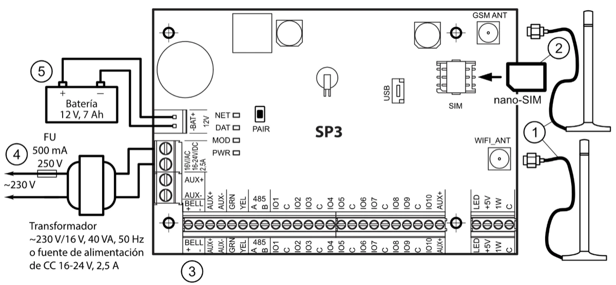 Si el sistema de alarma actual de hasta 64 zonas no admite agregar, por ejemplo, zonas inalámbricas, agrupación de zonas y controles remotos, no hay opción para permitir que una compañía de seguridad se encargue de proteger las instalaciones, o no hay la facilidad para permitir que el propietario de las instalaciones o los miembros de su familia supervisen y controlen el sistema de alarma de forma remota con la aplicación móvil de Protegus2. En estos y muchos otros casos se debe reemplazar la placa del panel de control con la placa „FLEXi“ SP3 y establecer los valores nominales de todas las resistencias de los circuitos EOL (End-Of-Line) del sensor del sistema mientras se programa el „FLEXi“ SP3.