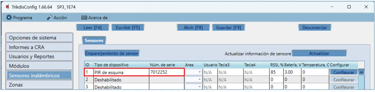 Núm. de serie – número de serie del sensor de temperatura leído por el panel de control.