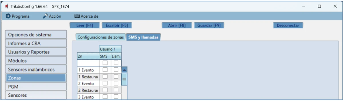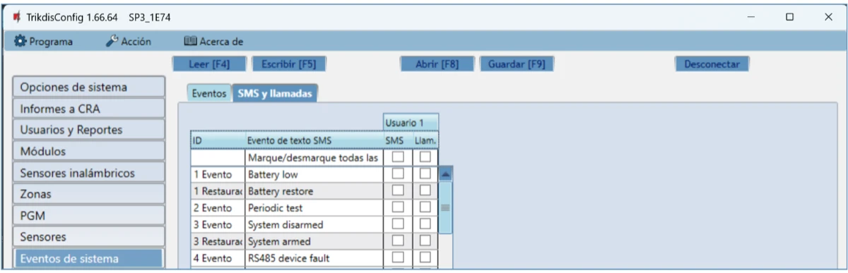 Usuario / SMS y Llamada – elige las formas en que se informará a los usuarios sobre cada evento: mensaje SMS y/o Llamada telefónica.