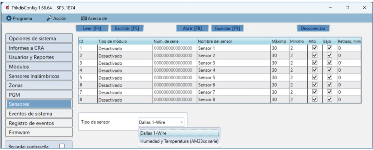 | Máximo de sensores de temperatura conectados al bus de datos de 1-Wire | 8 (Dallas) o 1 (si se usa un sensor de la serie AM2301) |