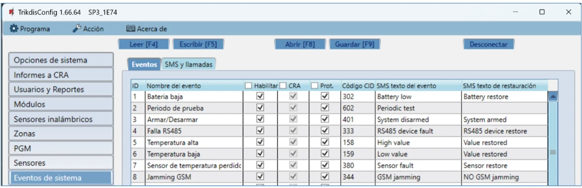 Envía informes de eventos a través de mensajes SMS a 8 números telefónicos.