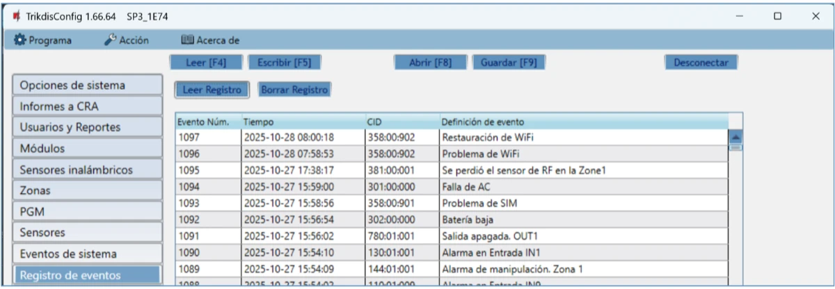 Botón Leer Registro – comando para leer el registro de eventos desde la memoria del dispositivo.