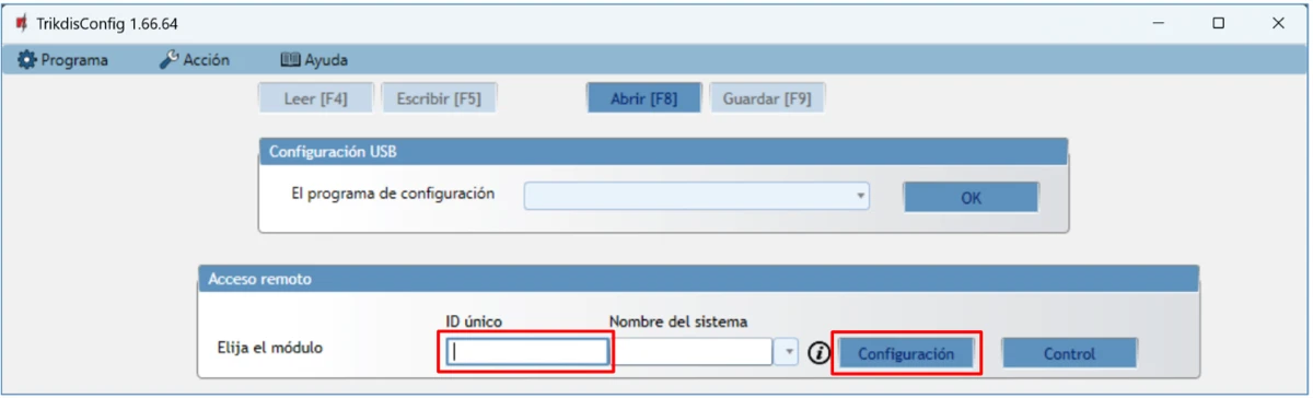 Configuración del dispositivo mediante cable USB o de forma remota con el software TrikdisConfig.