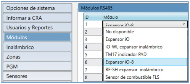 Vaya a la ventana Módulos y haga clic en una fila libre en el panel "RS485 Módulos". Seleccione "Expansor iO-8" en la lista desplegable como se muestra: