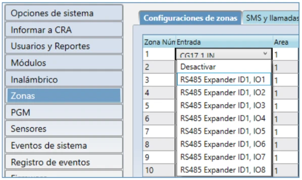 En la selección del menú desplegable ENTRADAS y SALIDAS (Zonas y ventana de PGM) verá las entradas y salidas de iO-8, que puede habilitar.