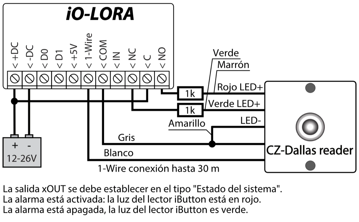 El lector iButton CZ-Dallas se conecta al iO-LORA utilizando el bus de datos "1 Wire". La longitud de los cables que se conectan al bus de datos puede ser de hasta 30 m.