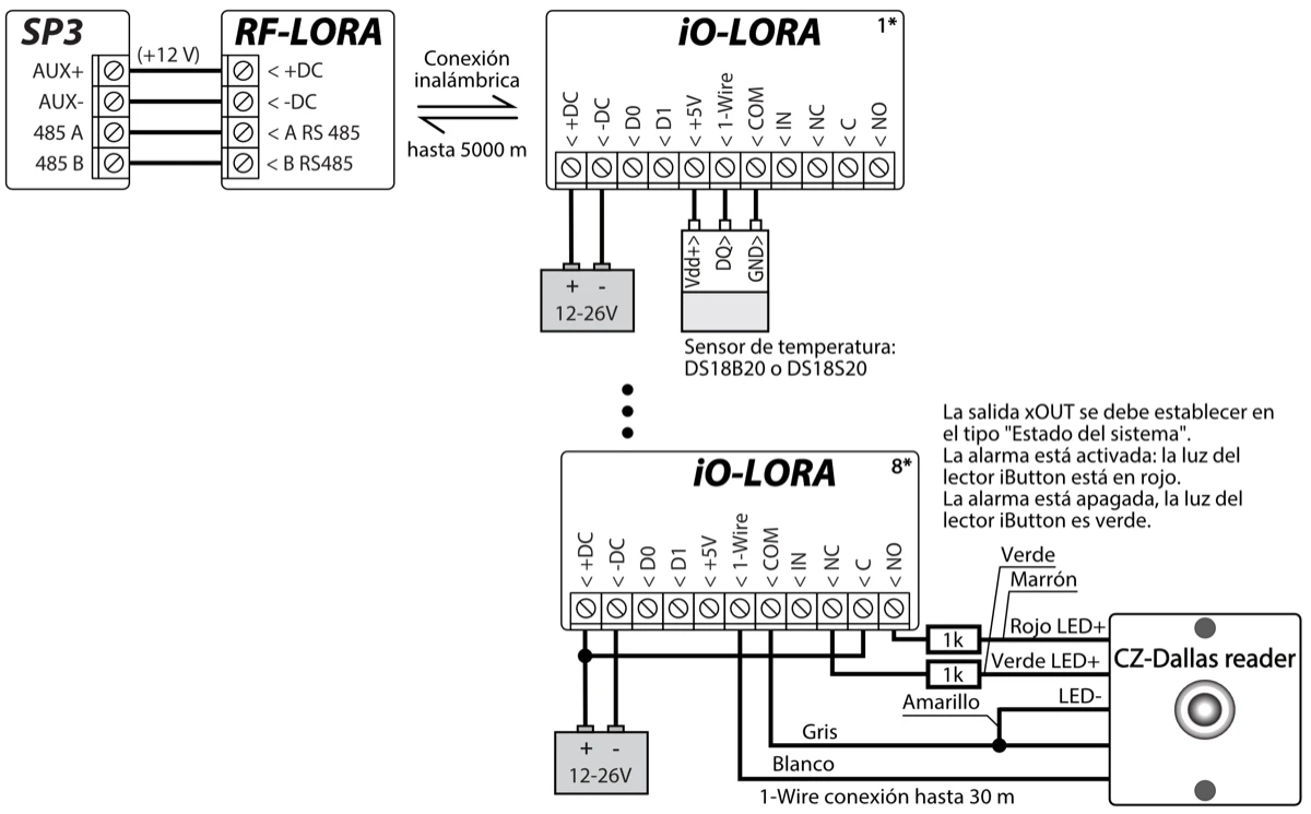 Se debe conectar un transceptor RF-LORA al panel de control "FLEXi" SP3 y se pueden conectar hasta 8 expansores inalámbricos iO-LORA. / Se recomienda utilizar un cable de par trenzado (UTP4x2x0,5 o STP4x2x0,5) para conectar el sensor de temperatura. / Lectores de llaves CZ-Dallas iButton y sensor de temperatura conectados al bus "1-Wire".