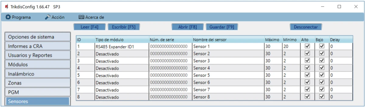 Haga clic en Leer [F4] para ver los parámetros actuales "FLEXi" SP3. Si se le solicita, introduzca el código del administrador o instalador de en la ventana emergente.