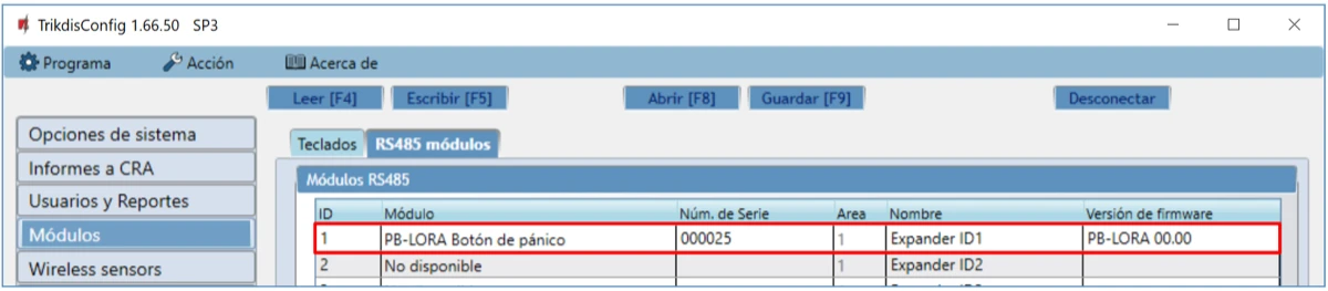 En la lista de "Módulos", la línea " PB-LORA Botón de pánico" indicará la versión de Firmware.