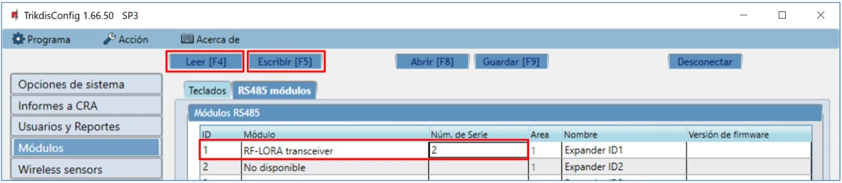 En el campo "Núm. de Serie" introduzca el número de serie del módulo RF-LORA.