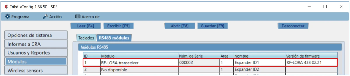 En la lista "Módulos", la línea "RF-LORA transceiver" indicará la versión de firmware.