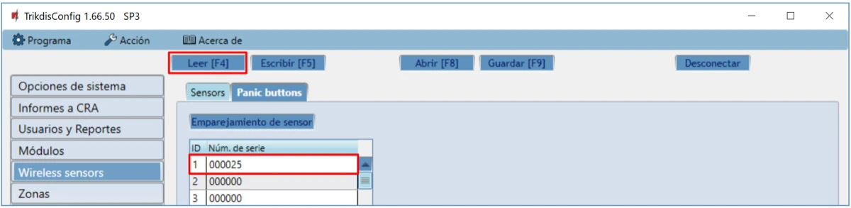 En TrikdisConfig, la ventana "Sensores inalámbricos" contendrá una lista de botones de pánico PB-LORA registrados. El campo "Núm. de Serie" contendrá los números de serie de 6 dígitos de los botones de pánico, que deben coincidir con los números de serie de PB-LORA impresos en la parte posterior de la caja.