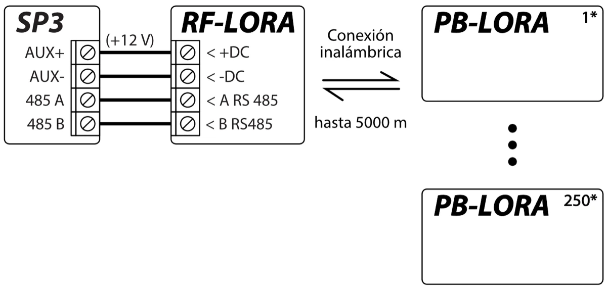 El transceptor RF-LORA debe estar conectado al panel de control "FLEXi" SP3. Hasta 8 botones de pánico inalámbricos PB-LORA (versión de firmware del panel de control 1.17 o superior. Por ejemplo: SP3_xxxx_0117.fw) o hasta 250 botones PB-LORA (si el panel de control tiene la 2 revisión de firmware 1.16 o superior. Por ejemplo: SP3_xxx2_0116.fw) se puede conectar al panel de control.