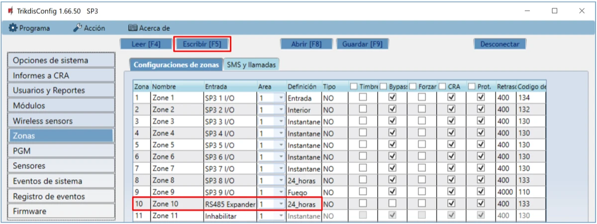 En TrikdisConfig, en la ventana "Sensores inalámbricos", ingrese "0" en el campo "Número de serie" y presione Escribir [F5]. El botón de pánico PB-LORA se elimina de la memoria "FLEXi" SP3.