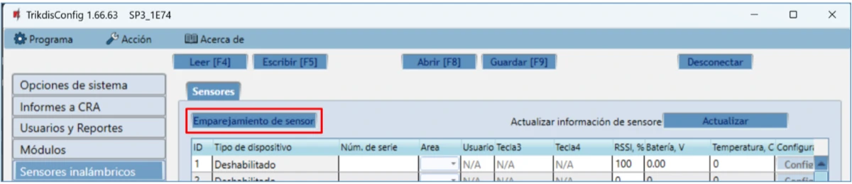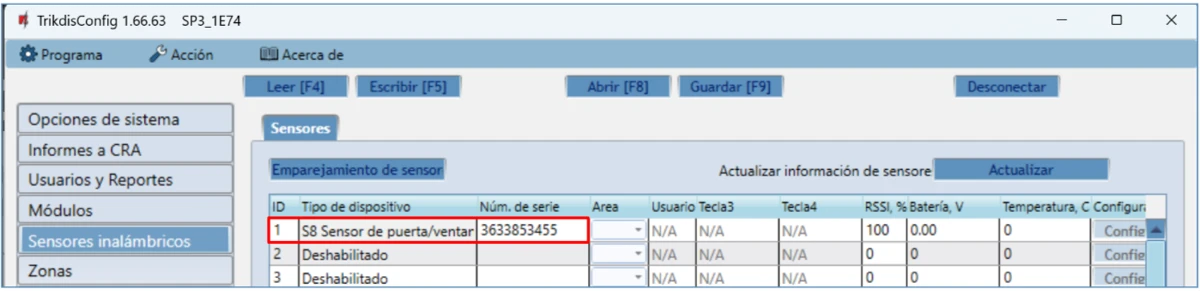 TrikdisConfig mostrará una lista de sensores inalámbricos registrados en la ventana „Sensores inalámbricos”. El campo "Núm. de serie" contendrá el número de serie.