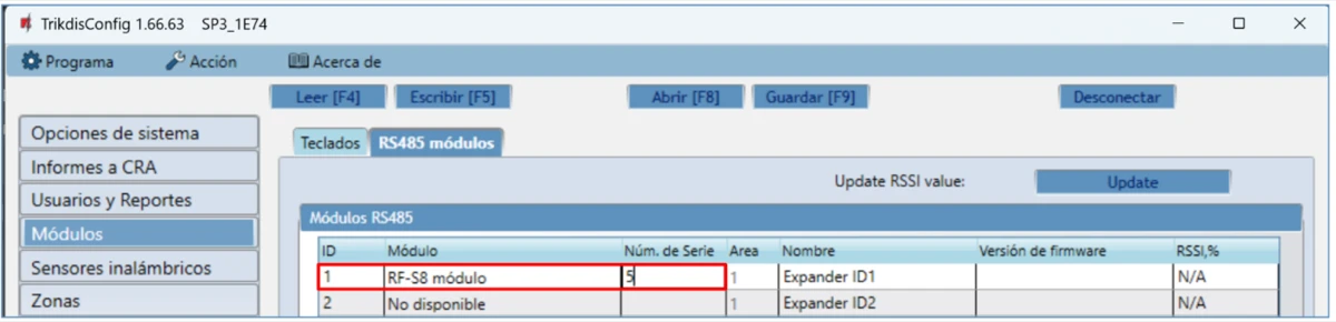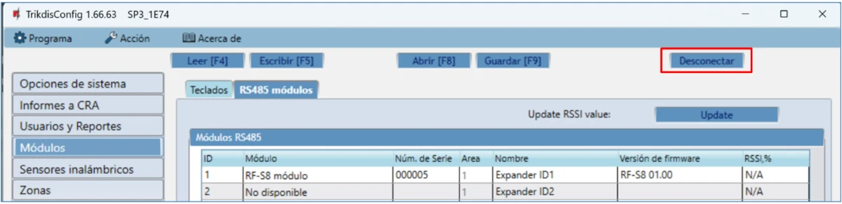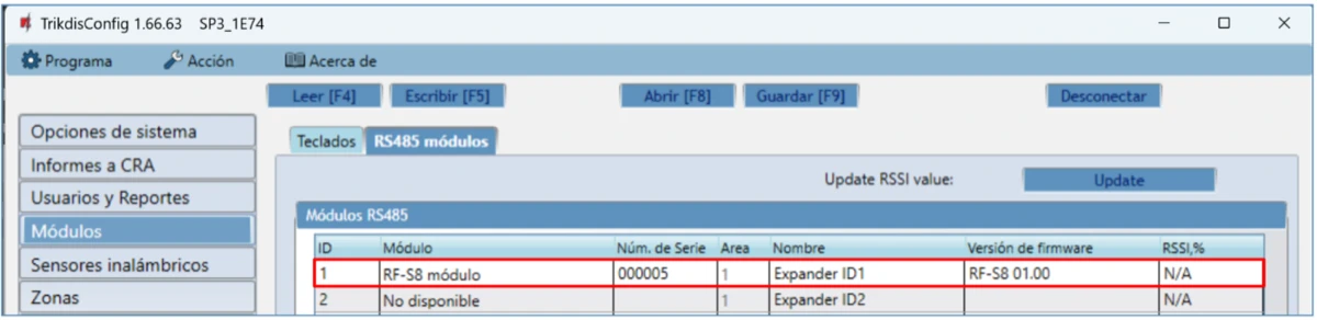 La versión de firmware del RF-S8 aparecerá en la ventana „Módulos”.