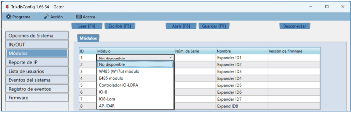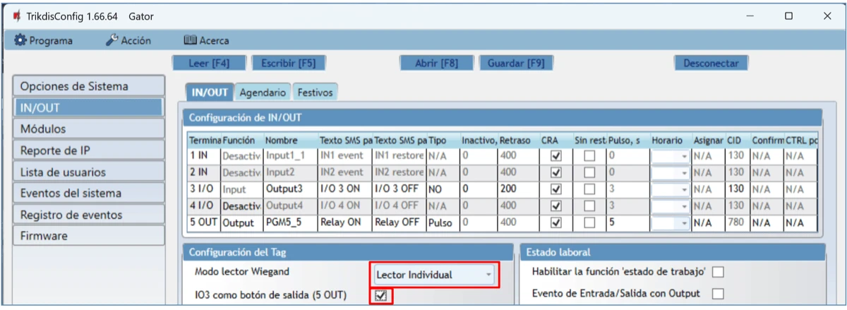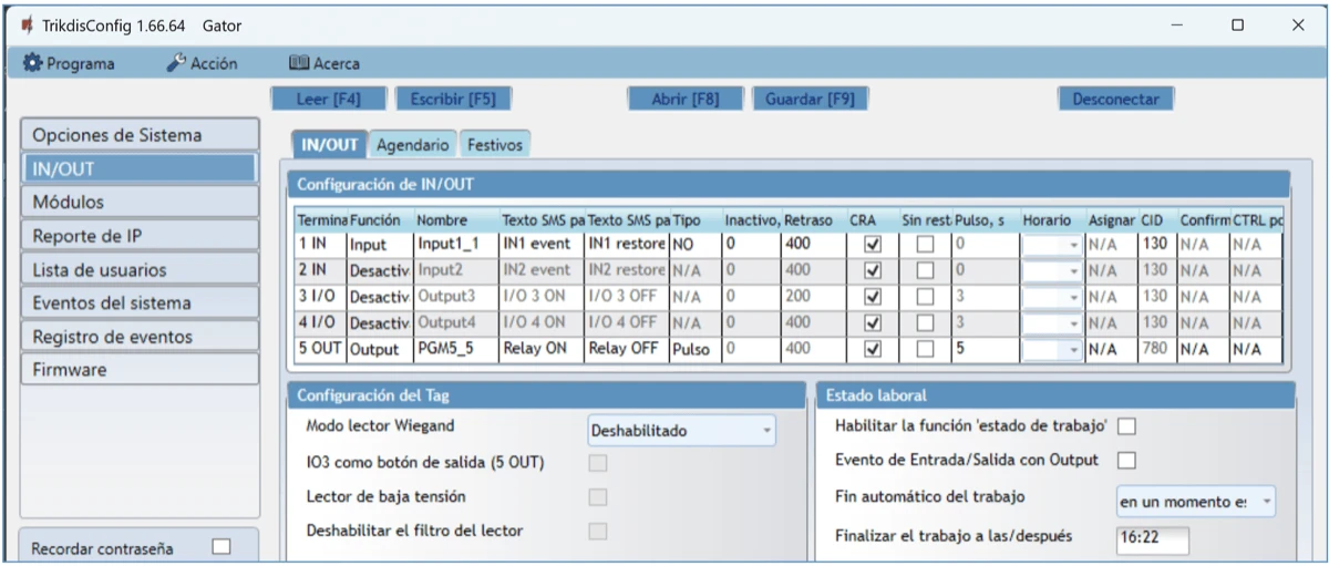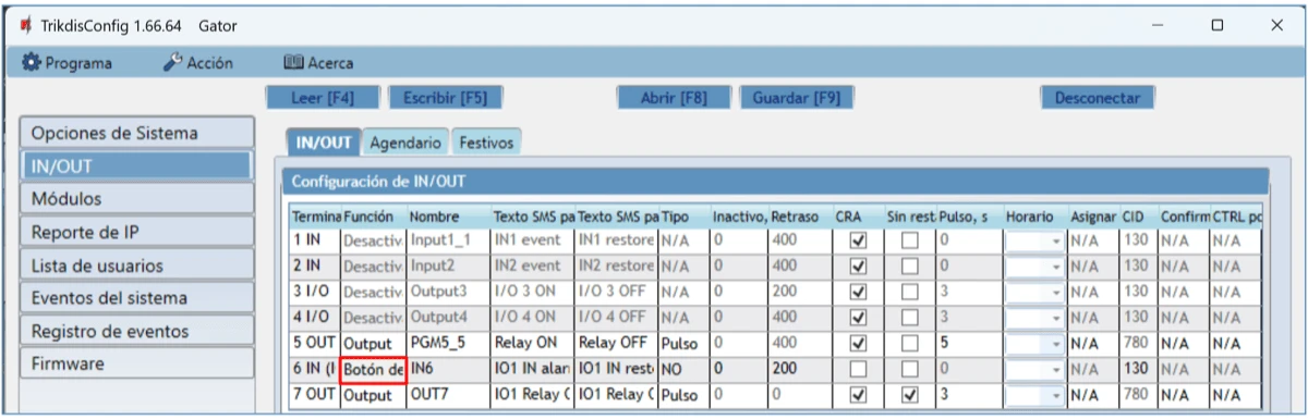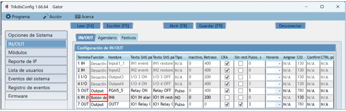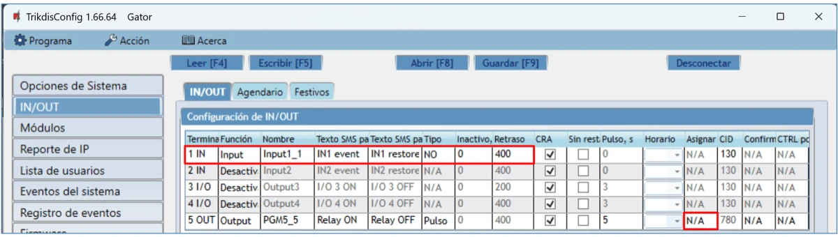 En la ventana "IN/OUT" de TrikdisConfig, asigne la entrada conectada a la salida controlador que controlará las puertas.