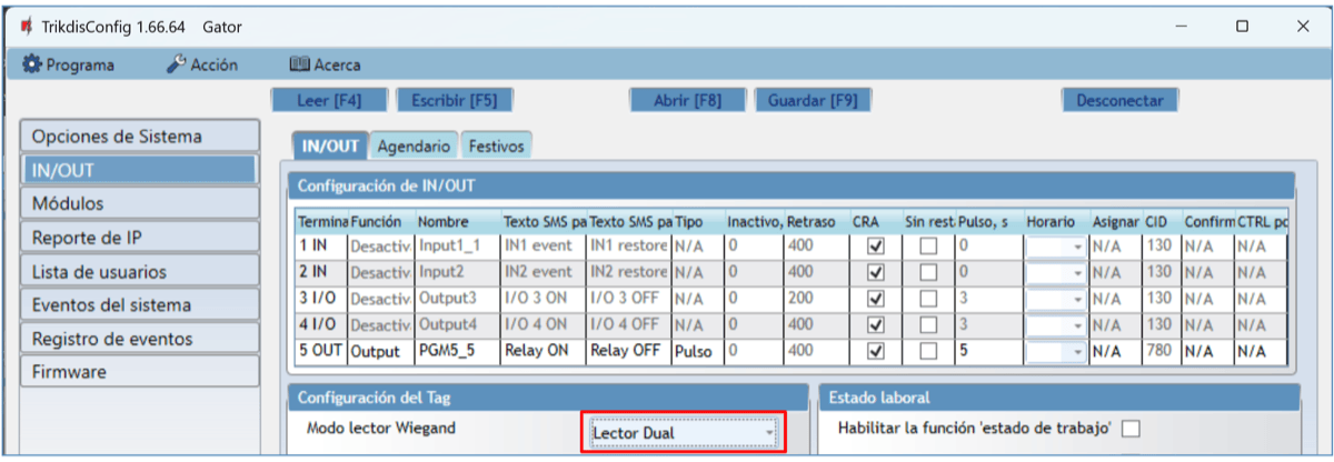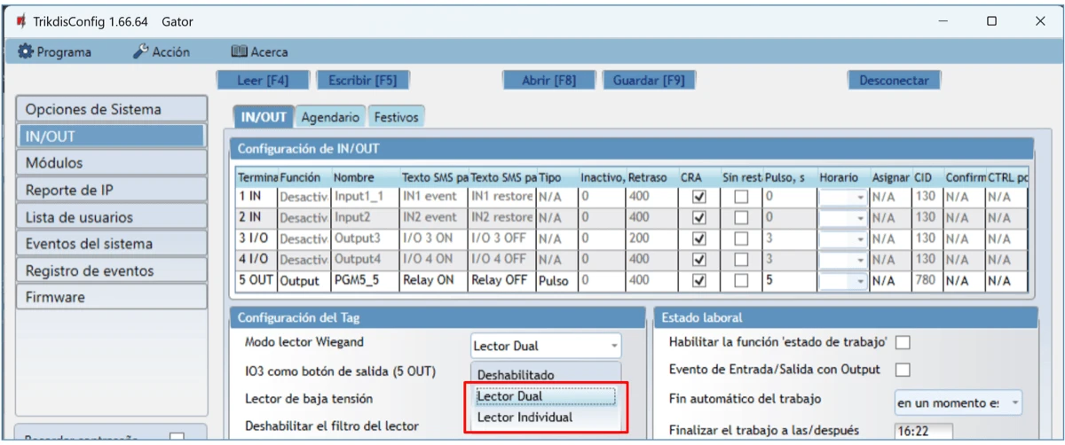 - Conecte el lector RFID al controlador (consulte la p.2.6 "Esquema para la conexión del lector RFID (Wiegand 26/34)"). Encienda el controlador. Conecte el cable USB Mini-B al controlador. Especifique cuántos lectores RFID están conectados en la ventana TrikdisConfig "IN / OUT".