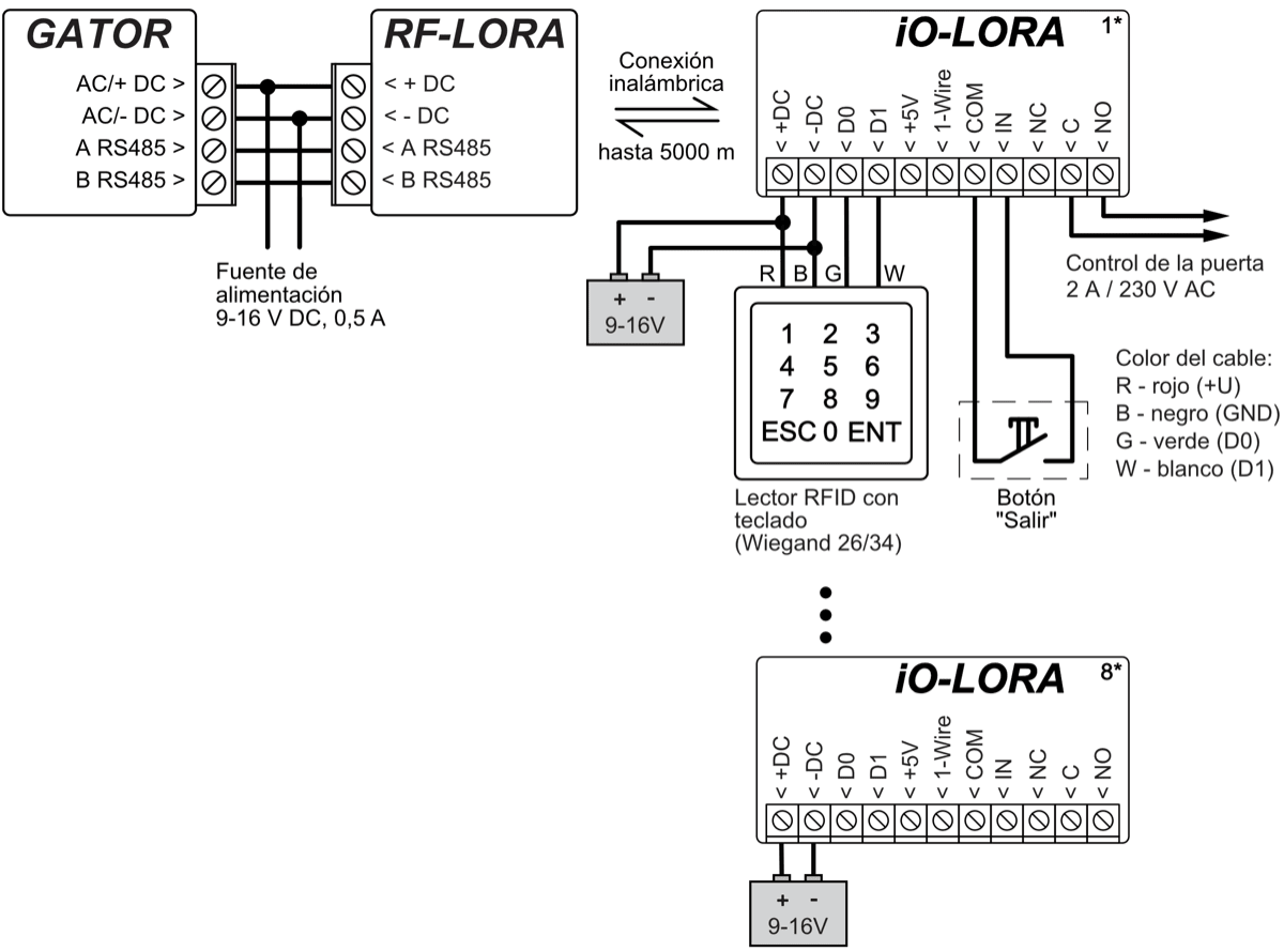 Con el expansor iO-LORA puede agregar adicionalmente 1 entrada y 1 salida (relé). Se pueden agregar un total de 8 expansores iO-LORA (agregue hasta 8 entradas adicionales y 8 salidas adicionales).