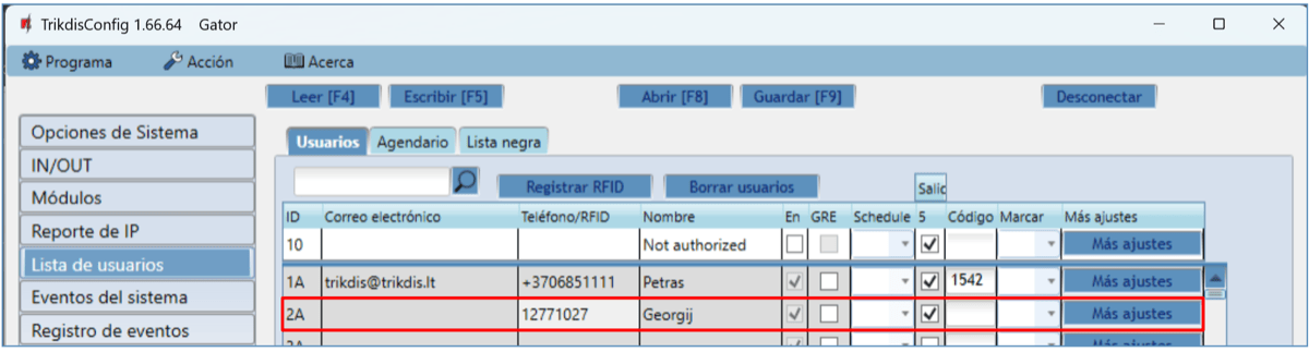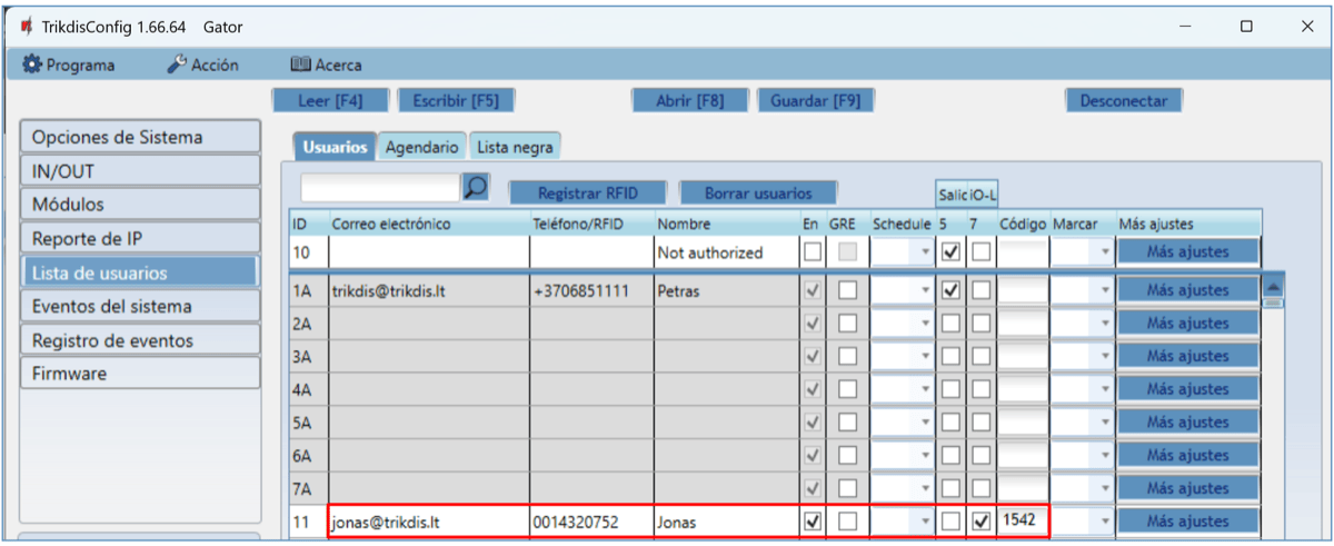 Los colgantes RFID (tarjetas) se pueden registrar en TrikdisConfig ingresando sus números de identificación en el campo Número de teléfono. Dé un nombre al usuario, marque el campo En. y un campo de “Salidas” gestionadas. Presione el botón Escribir [F5] para guardar la lista de colgantes (tarjetas) RFID en el controlador.