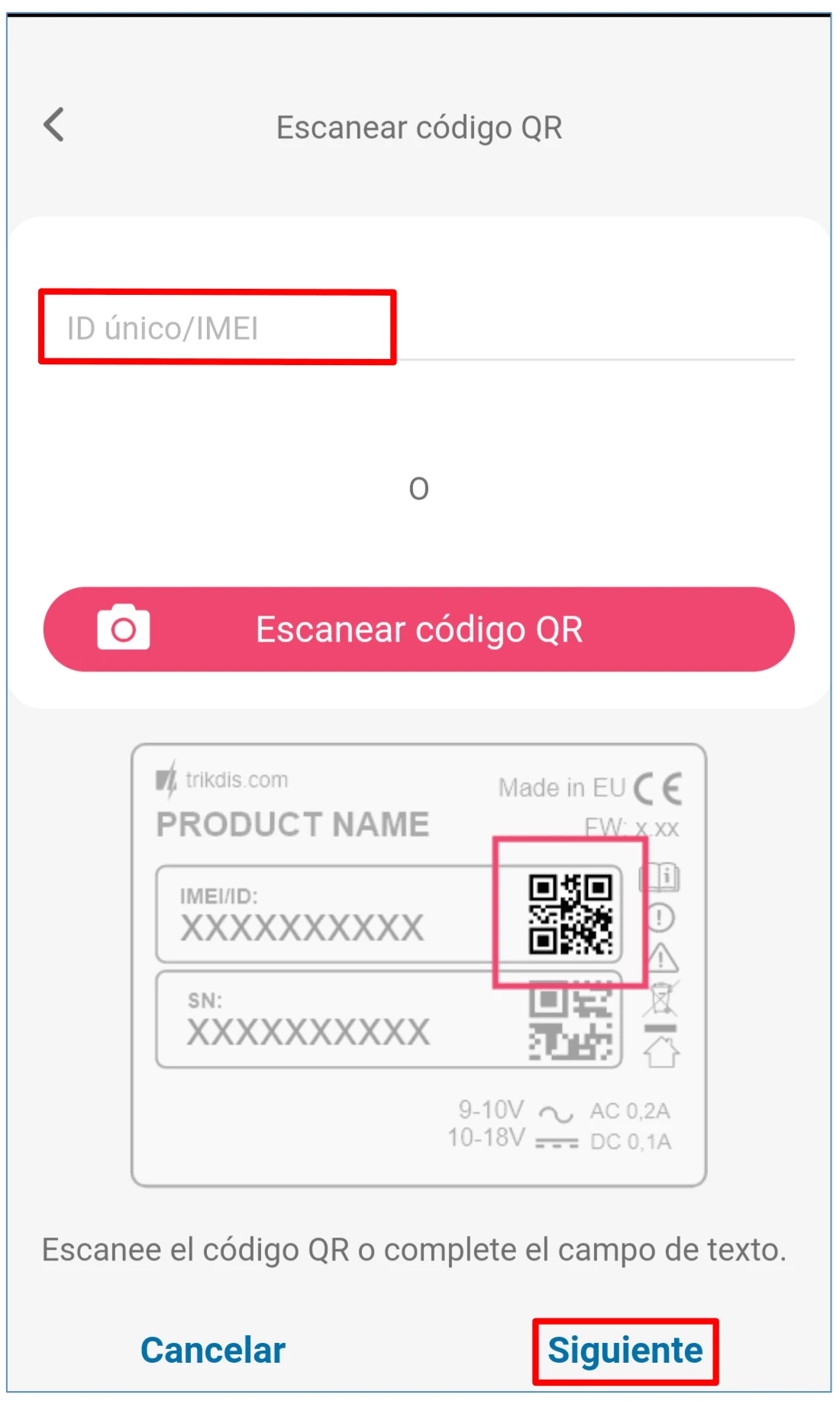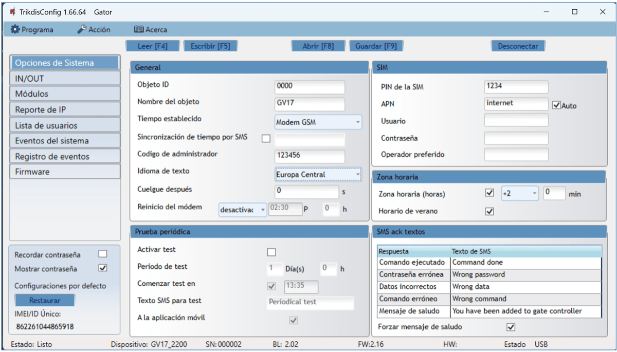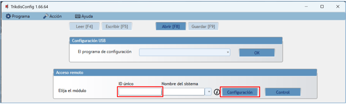 Poner en marcha el programa de configuración TrikdisConfig y en el campo “ID único” de la sección de acceso remoto introduzca el número IMEI de su controlador (el número IMEI se da en las etiquetas que se pueden encontrar en la parte inferior de la carcasa del dispositivo y en el embalaje).