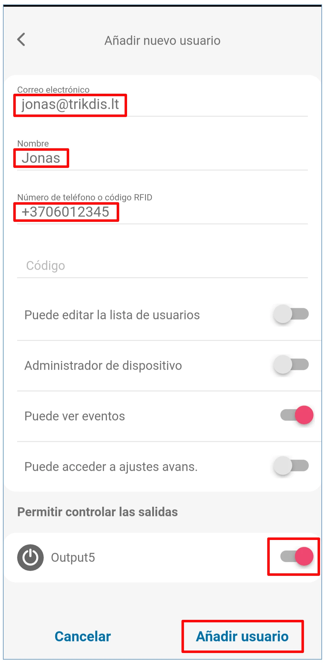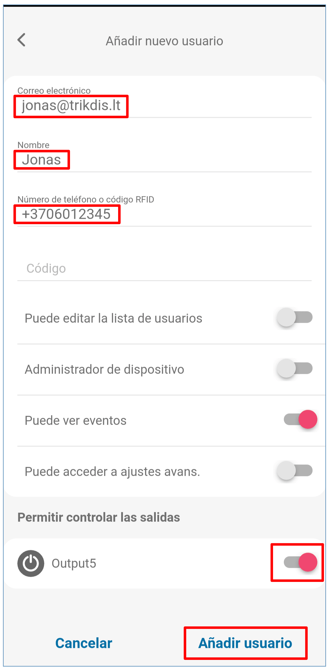 Puede controlar salidas - marcar el número de la salida que el usuario controlará.